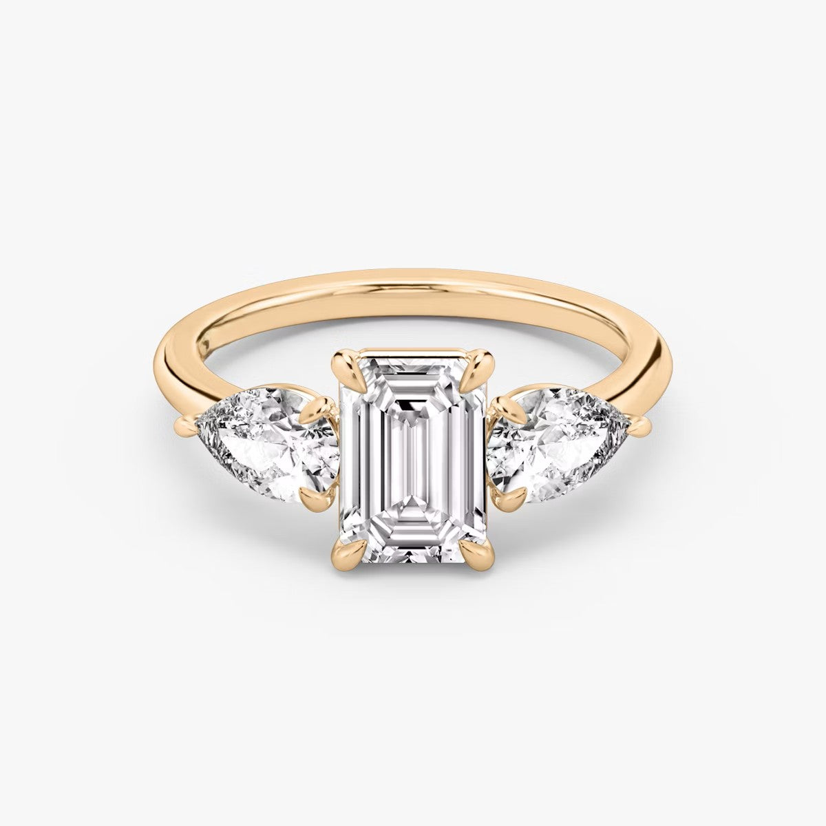 Emerald Cut - Plain Band - Three Stone Ring- 0.5 Ct Side Stone each - 14 K Gold