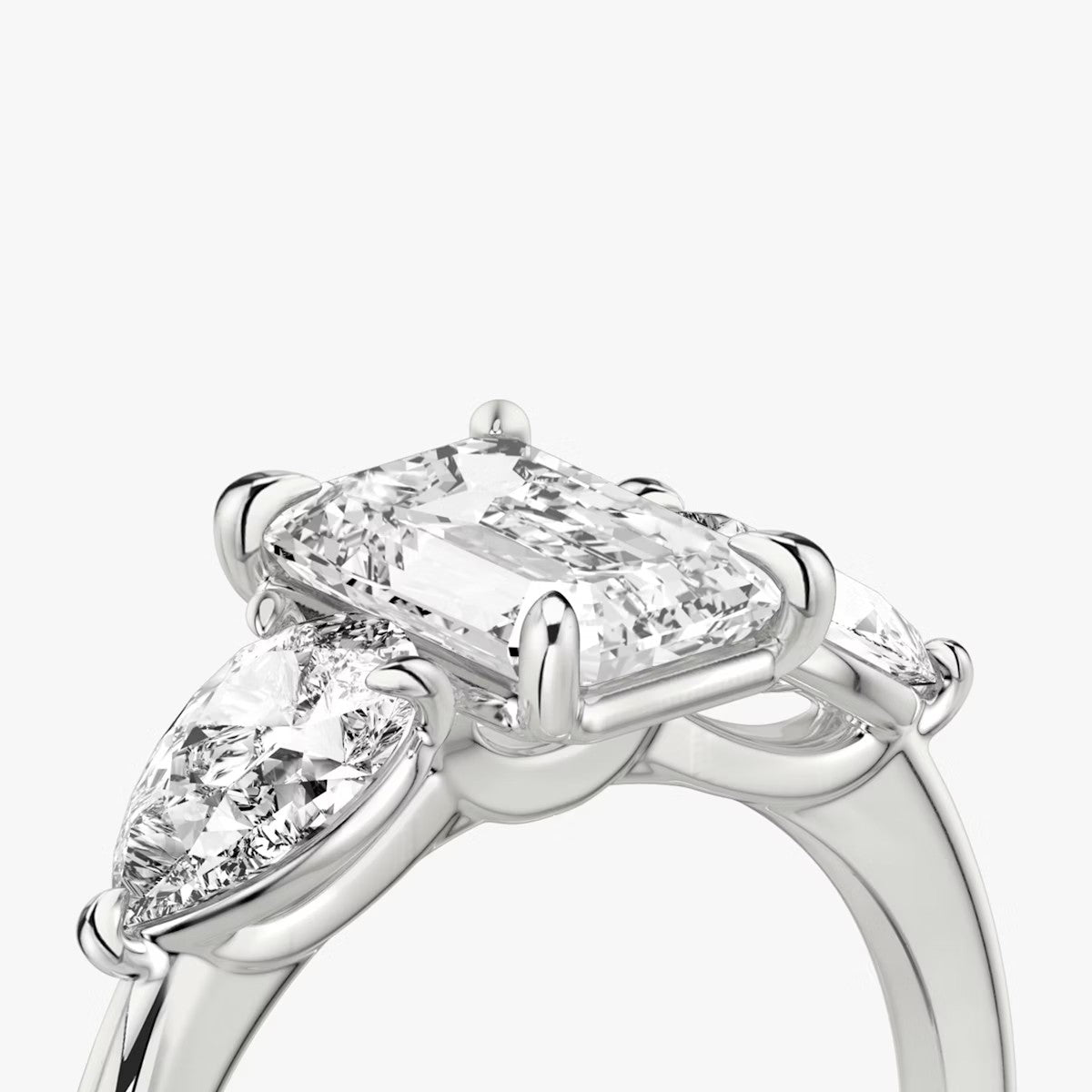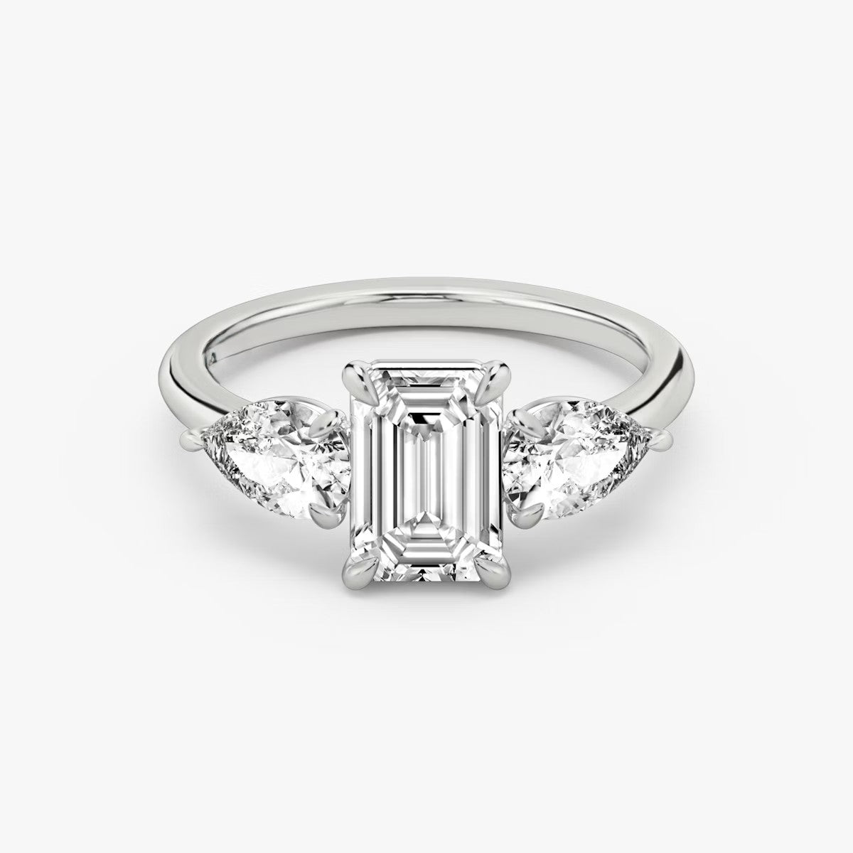 Emerald Cut - Plain Band - Three Stone Ring- 0.5 Ct Side Stone each - 18 K Gold